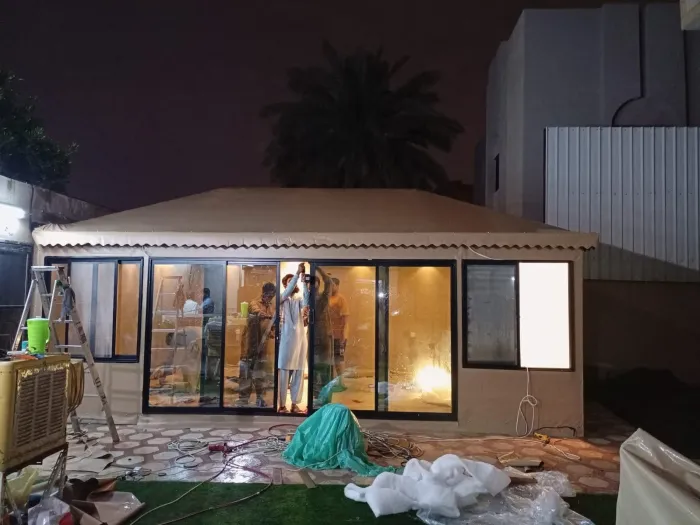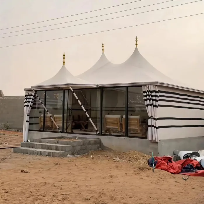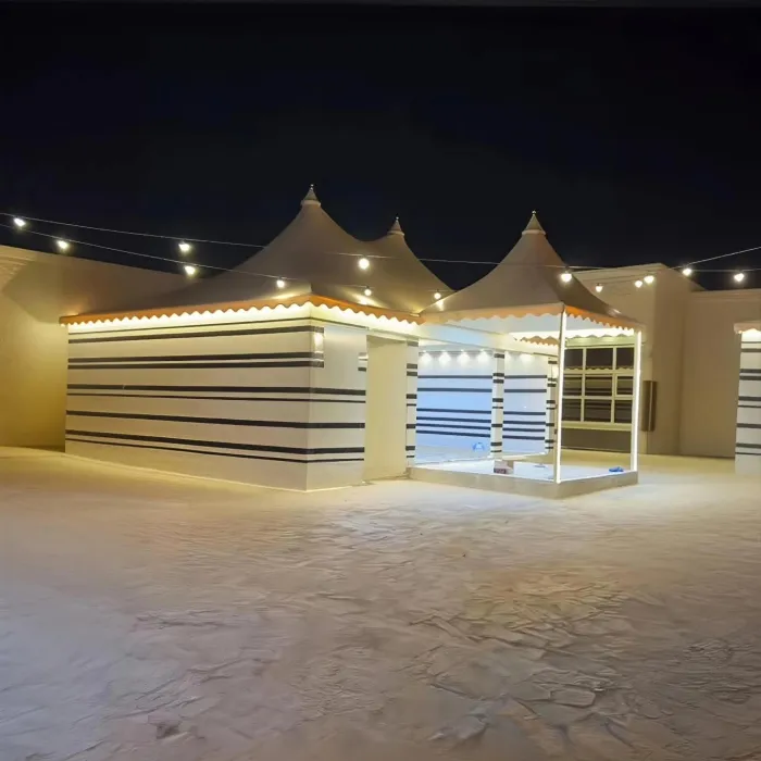 تجمع بين الفخامة والعملية، وتتضمن هيكلاً متيناً من الحديد المقاوم للصدأ، وعوازل حرارية ومائية عالية الجودة (كورية أو وطنية)، وأقمشة فاخرة (شعر مخطط أو PVC) مع بطانة داخلية، وأرضيات خشبية أو سيراميك، وتشطيبات داخلية فخمة (إضاءة، سدو، ستائر)، بيوت شعر الرياض. تركيب بيوت شعر