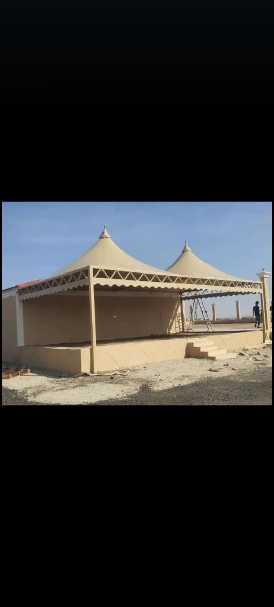 مظلات الشد الإنشائي: تصاميم عصرية تناسب المساحات الواسعة مثل الملاعب والمراكز التجارية.
