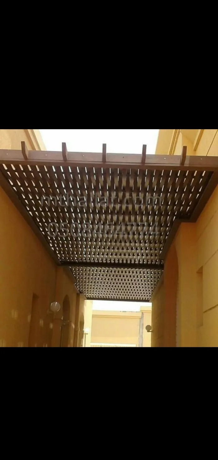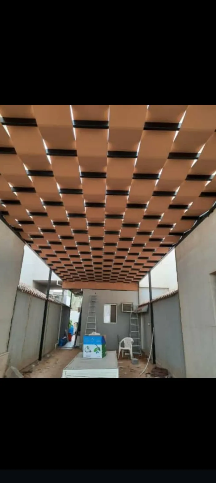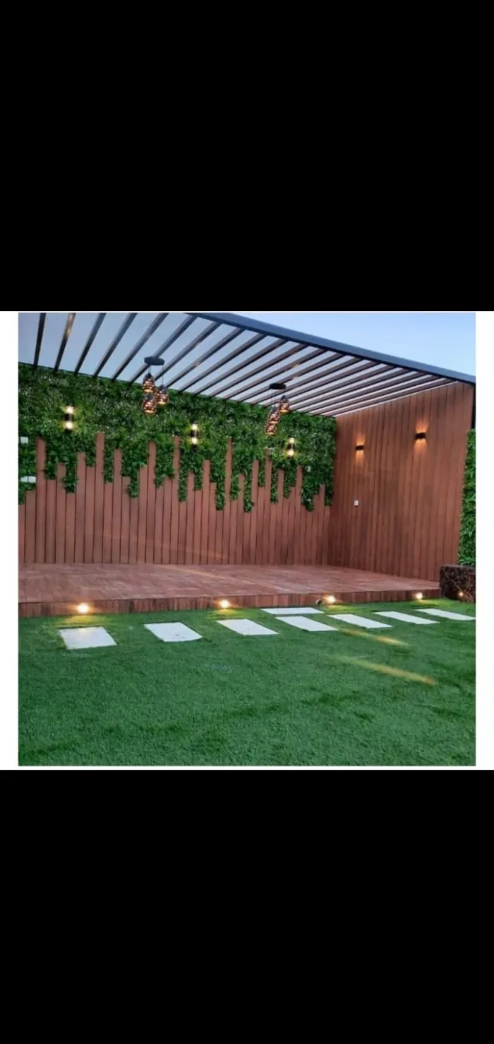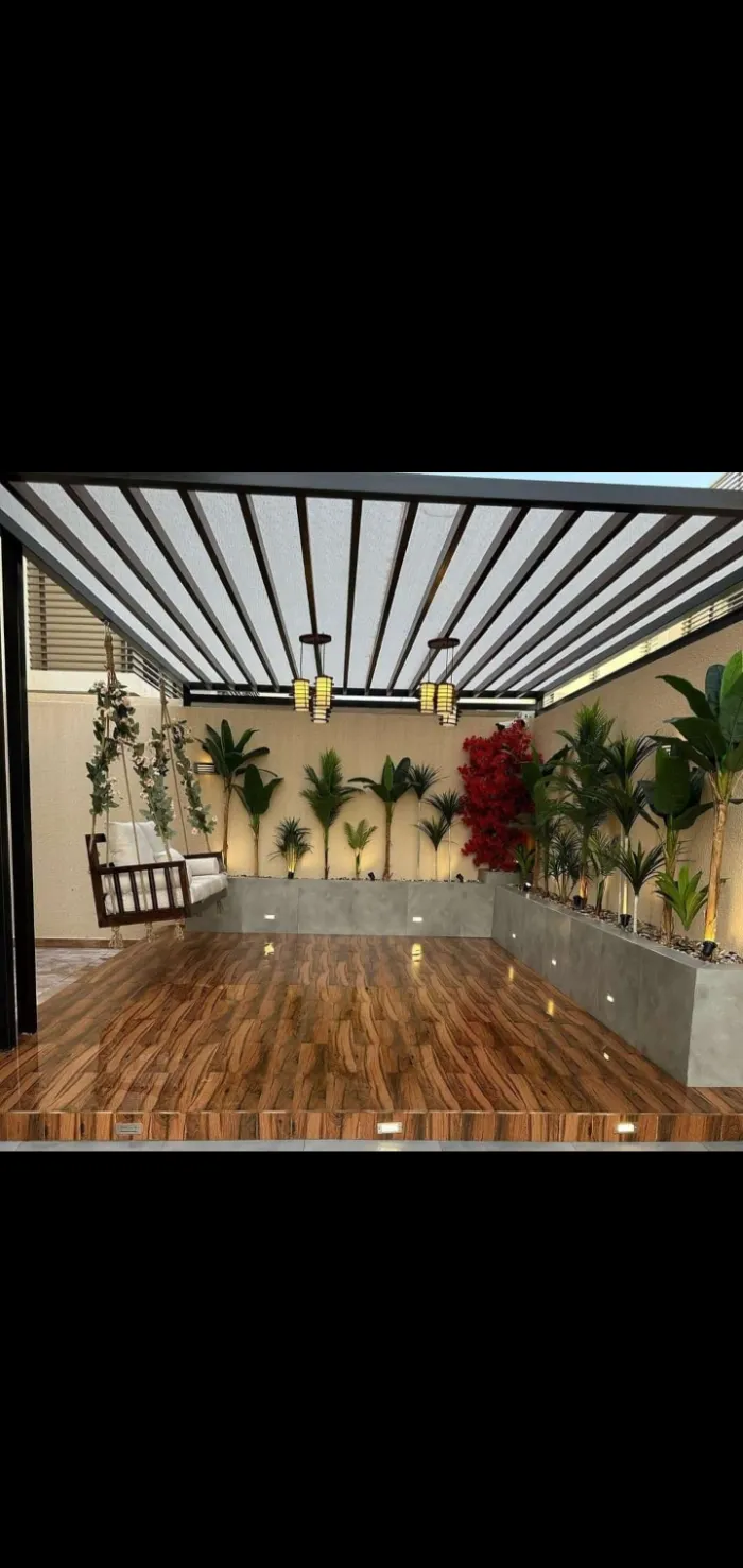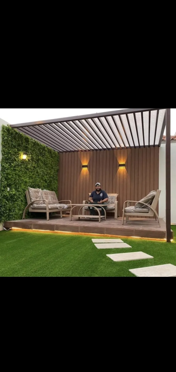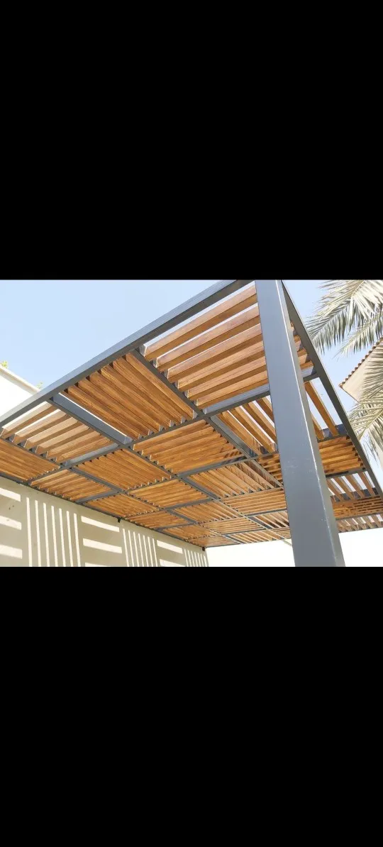 مظلات خشبية (طبيعية أو بلاستيك معالج WPC): تمنح مظهراً طبيعياً خلاباً للحدائق والبرجولات.